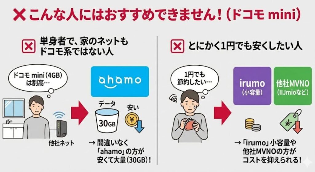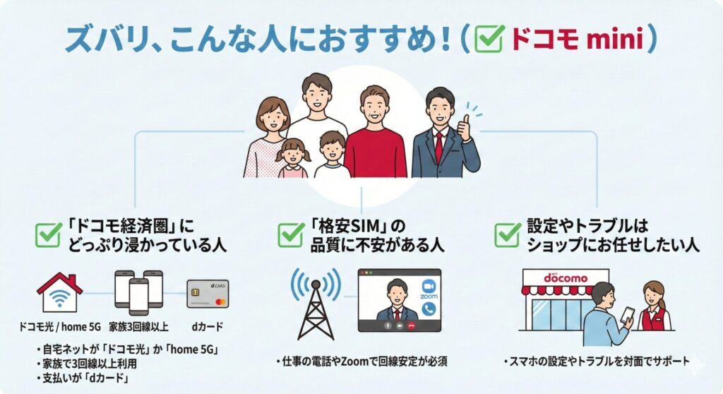 メリット・デメリットを踏まえると、「ドコモ mini」が推奨されるのは以下のような人です。