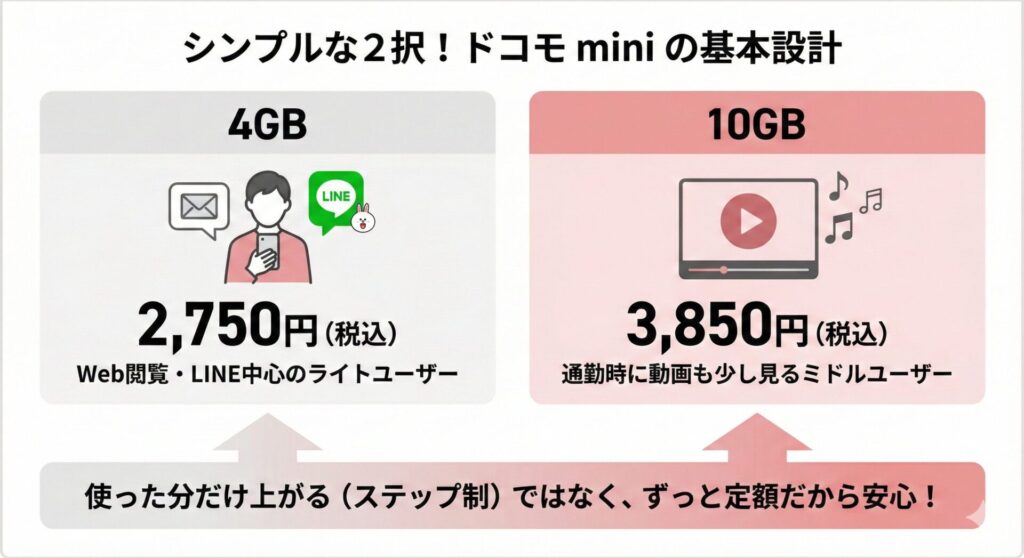 「ドコモ mini」は、データ使用量が少ない「ライト〜ミドルユーザー」向けの定額制プランです。