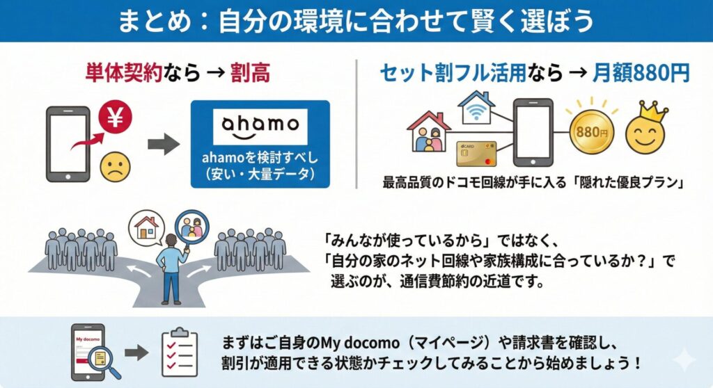 • セット割フル活用なら月額880円で最高品質のドコモ回線が手に入る「隠れた優良プラン」。